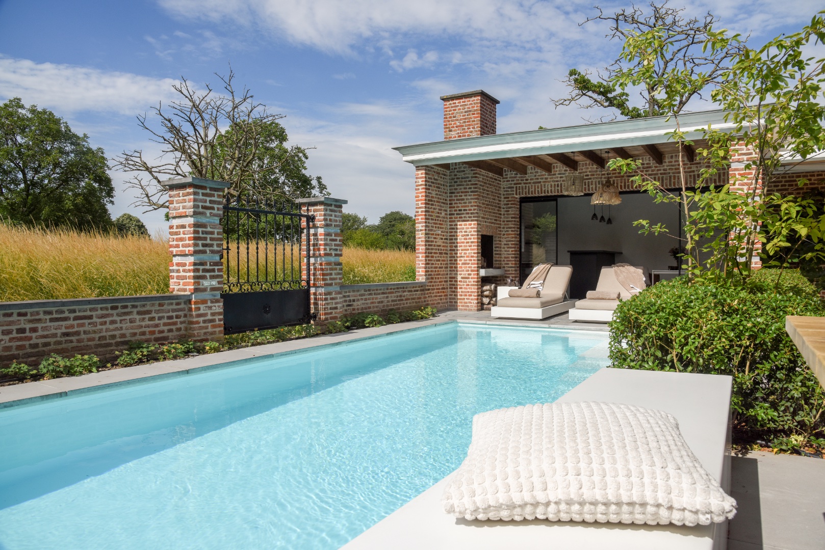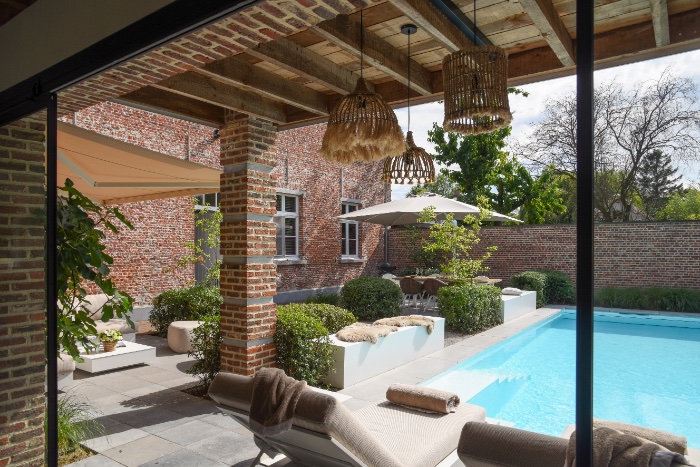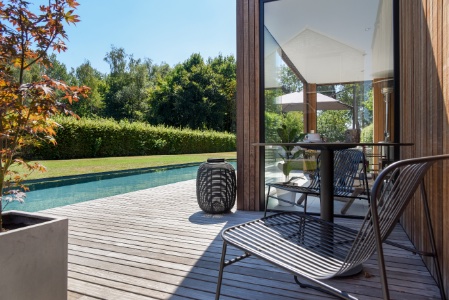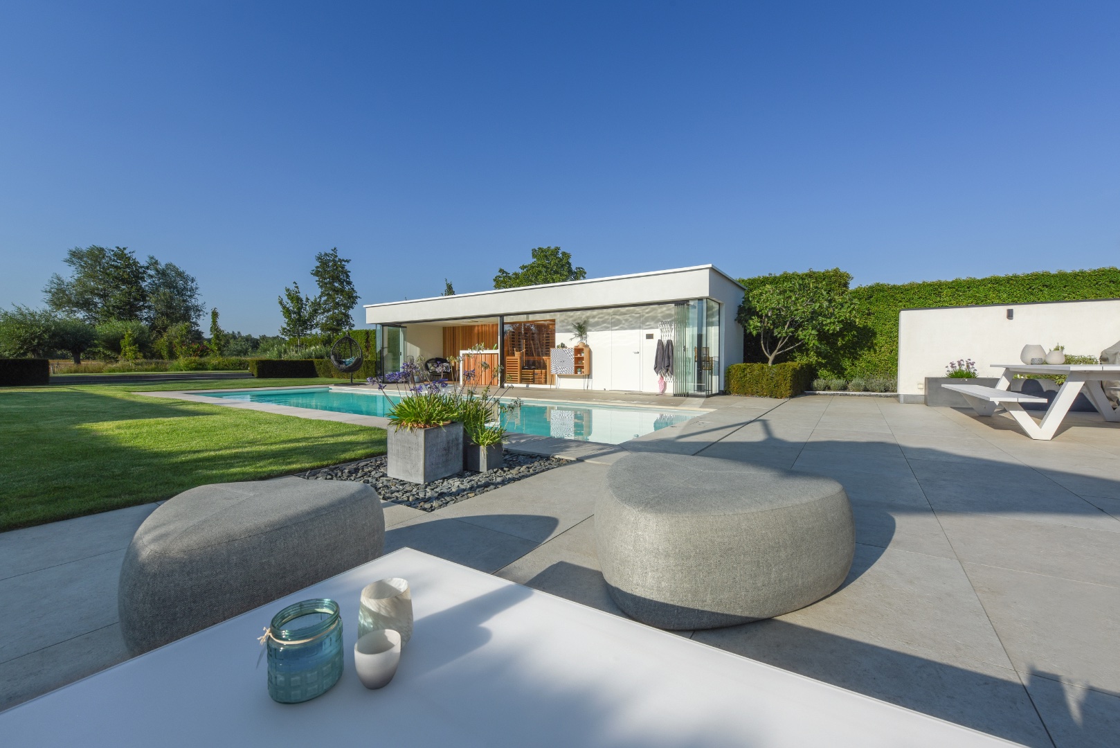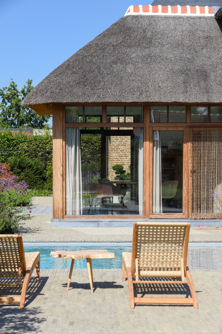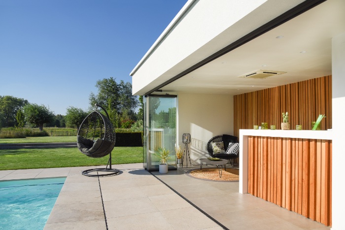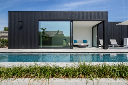 Een fraai poolhouse als verlengstuk van uw woning — voor berging, douche, lounge of buitenkeuken.